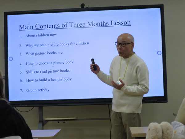 当日は、まず武藤理事長が英語で「シニアによる読み聞かせ活動」について講話を行い、続いて理事たちが絵本の読み聞かせを実演しました。【武藤理事長の講話はこちら 動画1 動画2 動画3】