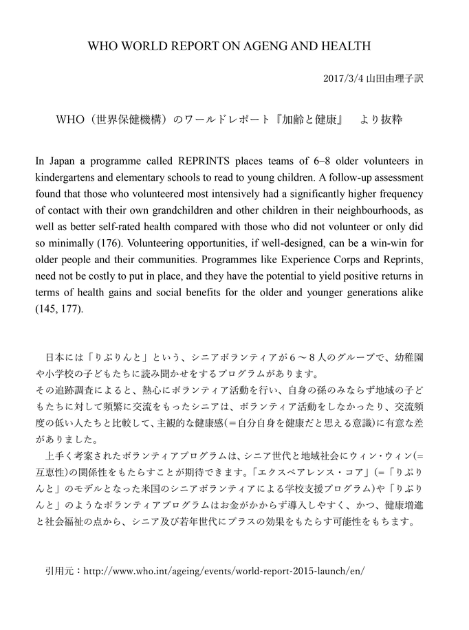 ☆WHO(世界保健機関)「WORLD REPORT(185ページ)」に「りぷりんと」が紹介されました。