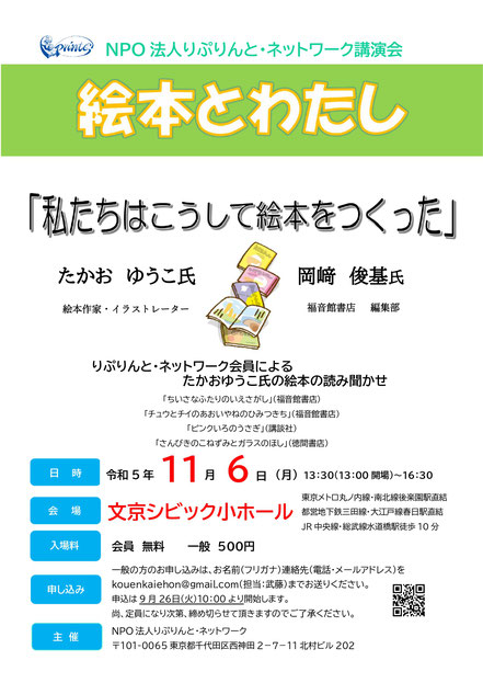 また、会員によるたかお氏の絵本作品4作の読み聞かせもお楽しみ頂けます。