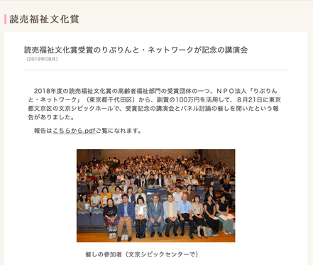 NPO法人りぷりんと・ネットワークが読売福祉文化賞を受賞(2018年12月11日)