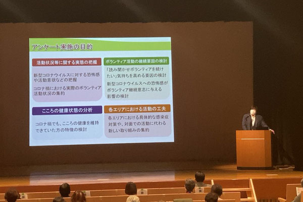 学習会は2部構成で、前半は研究所の先生方からの講演がありました。高橋先生からは、りぷりんとの会員に向けて実施された調査結果の発表があり、清野先生からは普段の生活でも実践できる体力維持の秘訣について紹介されました。休憩をはさんで、後半は4名のインストラクターによる読み聞かせの実践がありました。