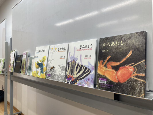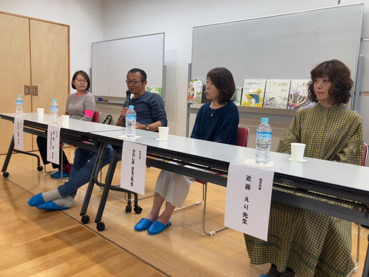 今回講師としてお招きしたのは、絵本作家の館野鴻(たてのひろし)先生。「しでむし」「がろあむし」「みかづきのよるに」「うんこ虫を追え」「ねことことり」等の生き物に関する絵本を数多く出版されてきた先生です。当日は、館野先生の絵本チームで一緒に制作活動をされているかわしまはるこ先生・なかの真美先生・近藤えり先生もご来場くださり、楽しいトークセッションが繰り広げられました。