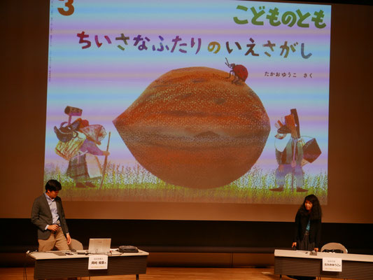 講師は、絵本作家でイラストレーターのたかおゆうこ氏と福音館書店で絵本の編集を担当している岡ア俊基氏、作家のたかお氏と編集者の岡ア氏が、どのようにして1冊の絵本を作り上げて行ったのかを対談形式で明らかにした。